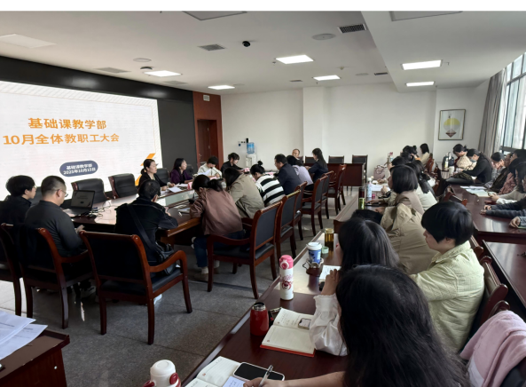 10月15日下午,基础课教学部在行政楼410室召开10月份全体教职工大会,会议由综合办主任郭锋主持,全体专兼职教师参会。